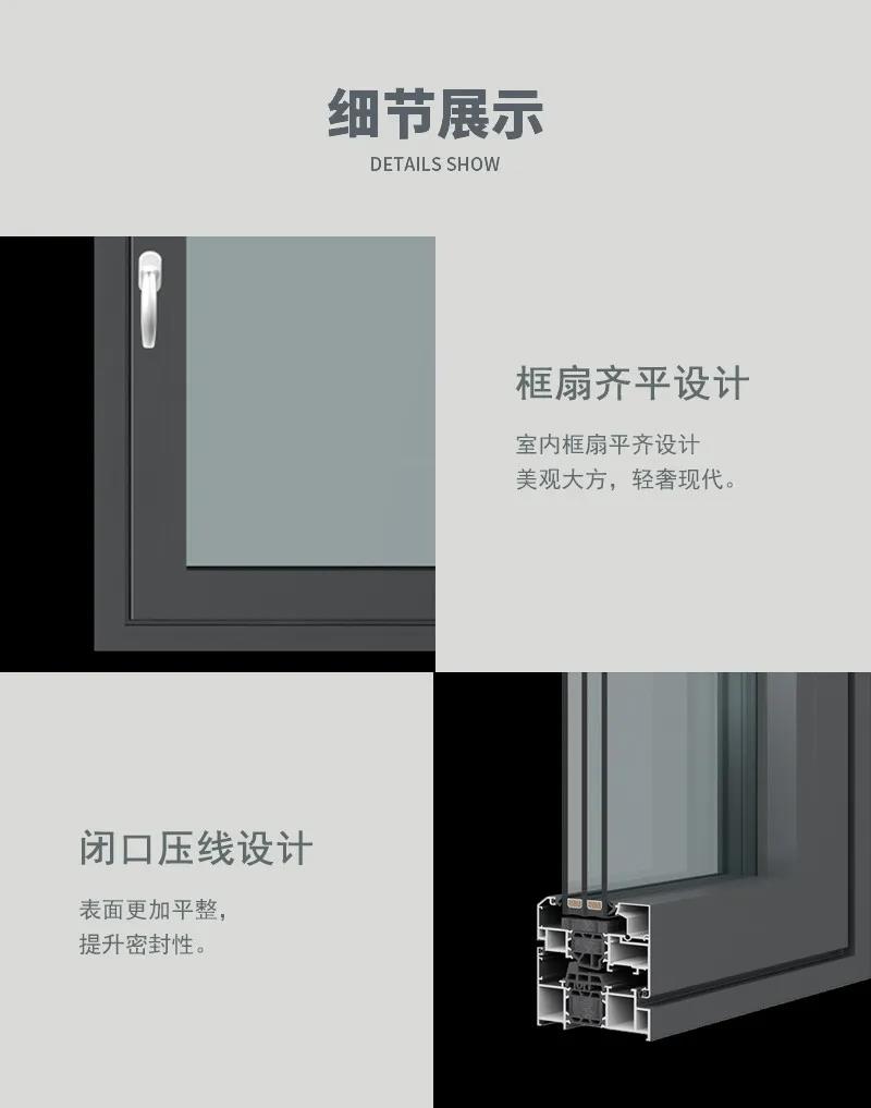 框扇齊平設(shè)計,金屬表面處理工藝,室外免打膠,防翹, 外觀現(xiàn)代、輕奢,美觀整潔。
